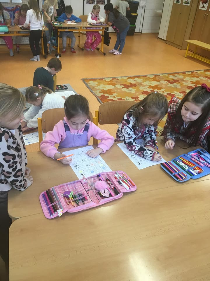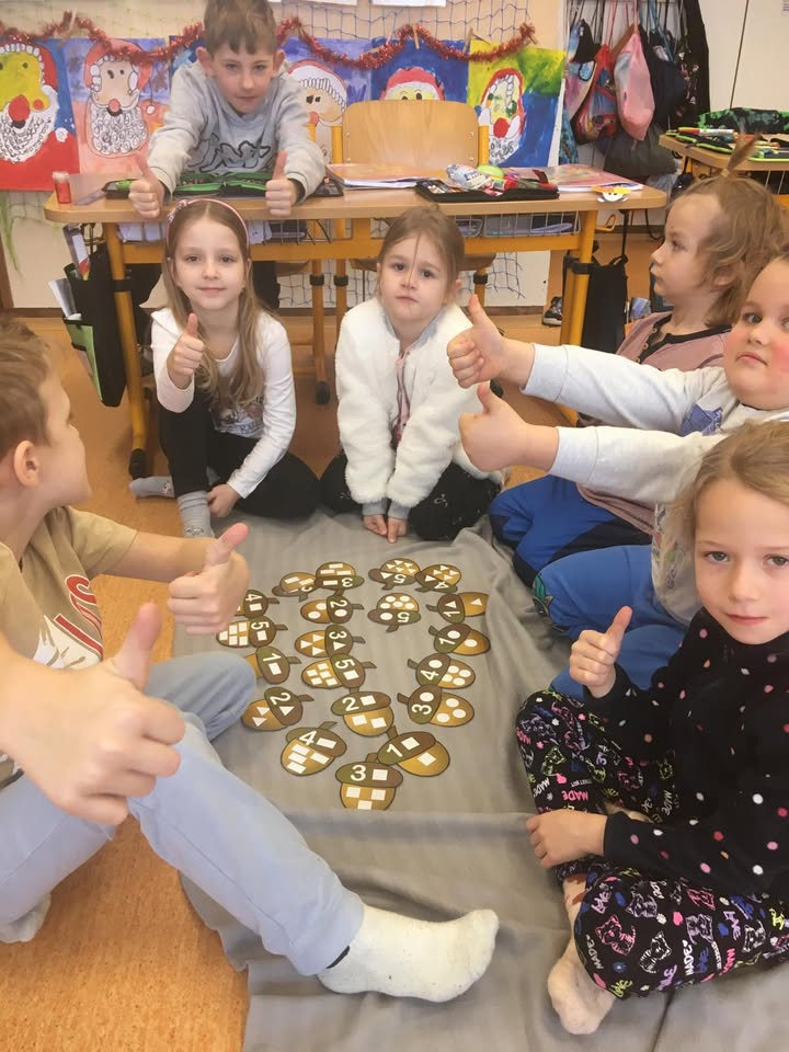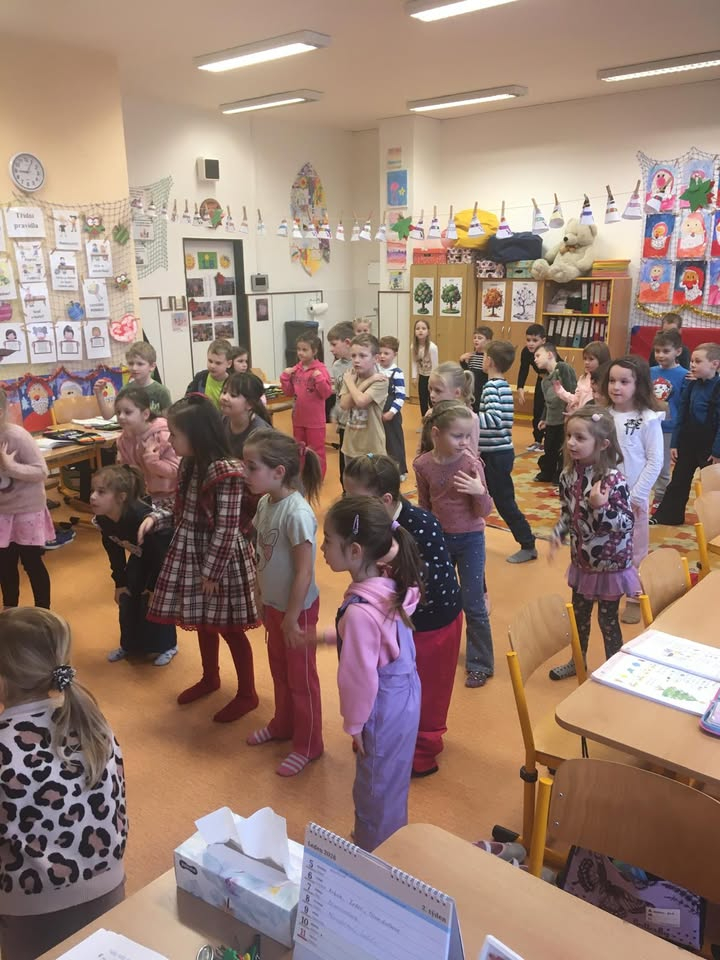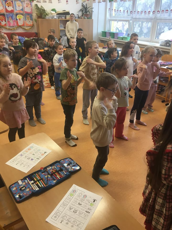 Návštěva školky v prvních třídách. Ve čtvrtek 8.1.2026 se přišly děti z MŠ Školské podívat do hodin v prvních třídách. Společně se přivítaly, zacvičily a podívaly se na ukázku čtení. Děti z první třídy předvedly dětem ze školky, jak už umějí číst a poznají písmenka. Následně procvičovaly početní představy na interaktivní tabuli, kde za odměnu sbíraly zlaté hvězdičky. Vyzkoušely si také sedět v lavici a plnit úkoly v pracovních listech a děti z první třídy jim pomáhaly. V závěru hodiny si mohly vyzkoušet aktivity na koberci ve skupinkách. Dětem ze školky i prvňákům se spolupráce moc líbila. Bylo to hezké dopoledne.