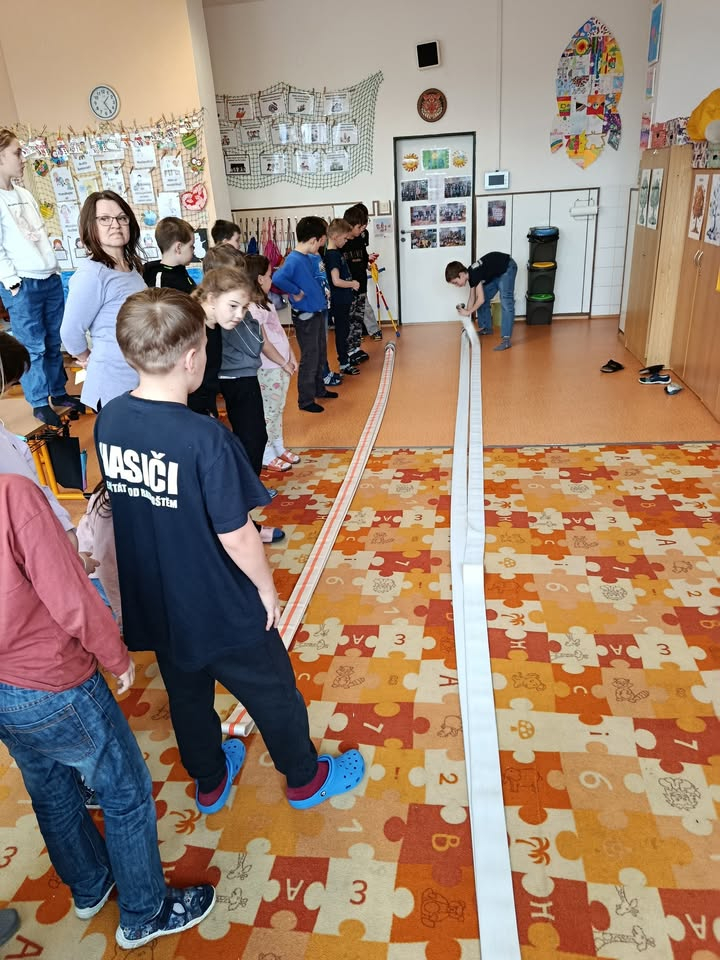 Dva žáci 4.B David Polášek a Filip Zátopek tentokrát všem pěti oddělením naší školní družiny představili svůj oblíbený hasičský sport. Ukázali nám také jak se vážou různé druhy uzlů, jak smotat hadici, jak správně posilovat své tělo a nakonec si dobrovolníci vyzkoušeli samotný závod s hasičskou hadicí. Klukům moc děkujeme!!!